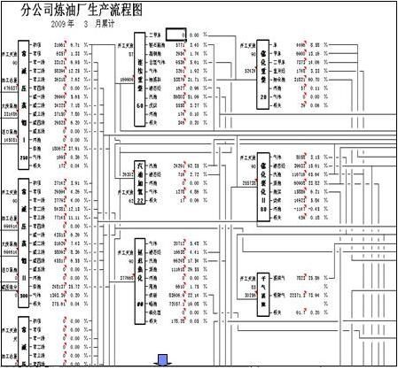 在领导开会时,给领导提供用B4纸打印的反应全企业、炼油、化工等情况的物料流程图,在图上领导可以清析明了的看到各个化工装置的单耗、炼油装置的收率、总投入、总产出、装置损失、各种物流走向、各种物料互供情况、库存情况、生产情况、外购情况、销售情况等各种数据。此功能简单易学,会使用EXECL的用户就会制作反应企业装置生产情况、各种物流走向、各种物料的互供情况、库存情况、生产情况的流程图,为领导及其他处室提供简单明了查看数据的方式。