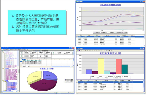 此系统通过网站为授权基层、分厂(事业部)、分公司等各个层次领导及其他处室业务人员提供各种数据;通过自定义EXECL报表模块、数据整合模块、系统的固定查询模块等查询数据;通过流程图功能模块查询数据;通过各种台账功能模块查询数据。