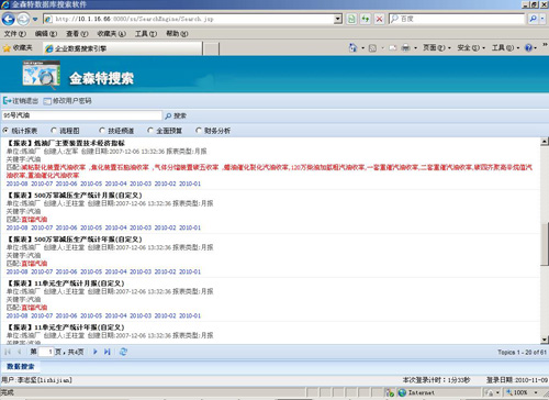 随着国家经济的飞跃,互联网的迅速发展,企业的信息化建设也得到了突飞猛进的快速发展, 各种信息化管理软件(财务系统、销售系统、电子商务、供应管理系统、项目管理系统、资产管理、 生产管理系统、人力资源管理系统等)也在企业大量的应用,成了企业管理的重要辅助手段。但是这些数据全部存储在各种系统的数据库(Oracle数据库、SqlServer数据库、Sybase数据库等)里, 对于数据使用者来说如何在各种数据库的海量数据海洋里找到他们需要的数据呢?传统的做法是翻箱倒柜找出纸质报表,一张张的进行查找;二是利用各个系统提供的网页及应用程序一个菜单一个菜单的进行查找,并且对于数据使用者来说那么多网站、那么多菜单也非常难记忆与查找。那么是否能有更加便捷方便查找方法呢?北京世圭谷科技有限公司开发的“企业数据搜索引擎”即金森特搜索可以轻松解决上述问题,让数据使用者利用 “企业数据搜索引擎”,只需在搜索框里输入所要查找信息,按下回车,搜索引擎会非常快的把数据使用者所需信息全部展示出来。 这样省去翻系统、翻报表、翻文件等等各种繁琐工作,大大节省了数据使用者的宝贵时间,为数据使用者提供方便。企业数据搜索引擎主要功能如下: